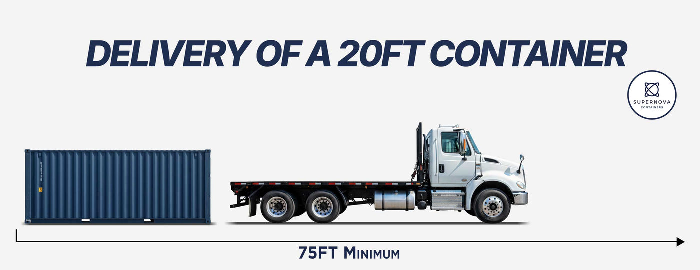 A 20 foot container is delivered using a 24 ft tilt-deck truck and needs a minimum of 75 feet (22.9 meters) of straight-line clearance for drop-off.