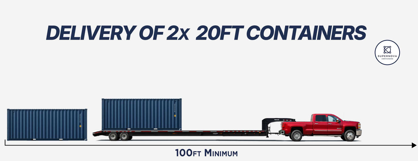 Your two 20ft containers will likely be delivered on a 40ft tilt-deck trailer. Your delivery site needs a minimum of 100 ft (30.5 m) of straight-line clearance.